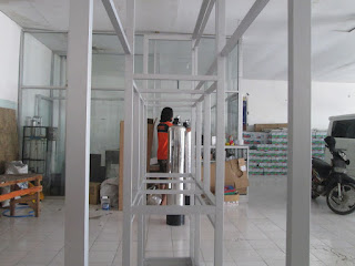 Gambar berikut adalah foto perakitan rangka aluminium untuk rak partisi depo air minum isi ulang untuk dua isi satu bilas . Di Rakit di PerumTAS 3 A8 no 15 Sidoarjo.